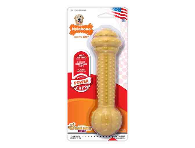 Calling all peanut butter lovers! This Nylabone Power Chew DuraChew Barbell has allergen-free peanut butter flavor throughout! Built to withstand the toughest chewers, this durable nylon dog toy for aggressive chewers keeps boredom at bay, and it has two unique textured ends that help clean teeth and freshen breath as they chew. That means two great benefits all in one dog bone!