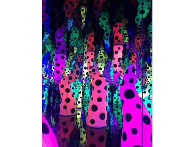 “Love is Calling,” which premiered in Japan in 2013, is the most immersive and kaleidoscopic of the artist’s Infinity Mirror Rooms. It is composed of a darkened, mirrored room illuminated by inflatable, tentacle-like forms—covered in the artist’s characteristic polka dots—that extend from the floor and ceiling, gradually changing colors. As visitors walk throughout the installation, a sound recording of Kusama reciting a love poem in Japanese plays continuously.