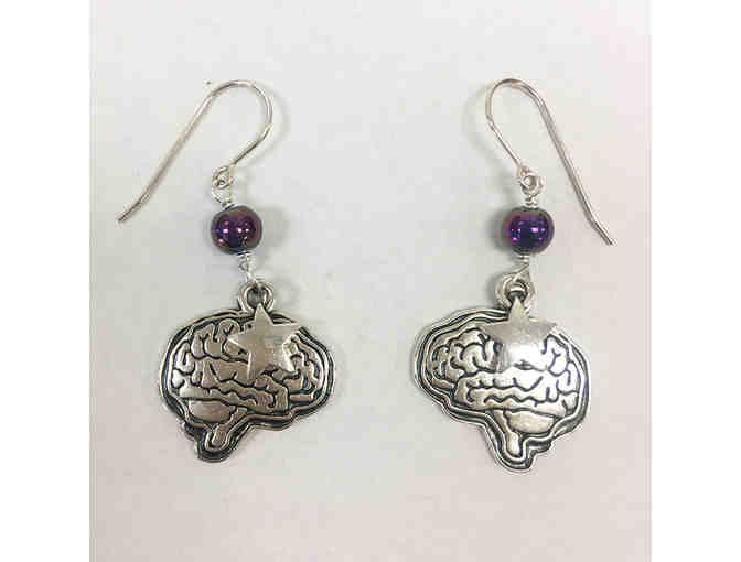 These fun earrings dangle about 2" long and feature a small star charm and a 1" wide brain charm.