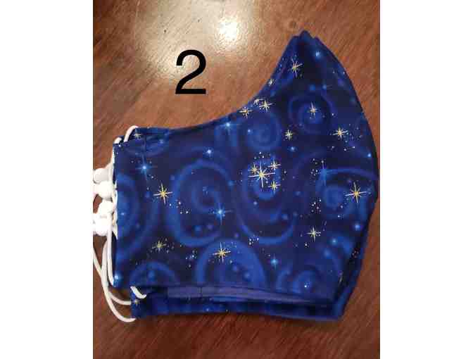 Beautiful Purple / Blue swirl mask with gold metalic designs in the fabric! Two layers of 100% cotton with slit for filter. Can be reversed to beautiful purple. The elastic for the ears has little adjusters included. Not for medical use.