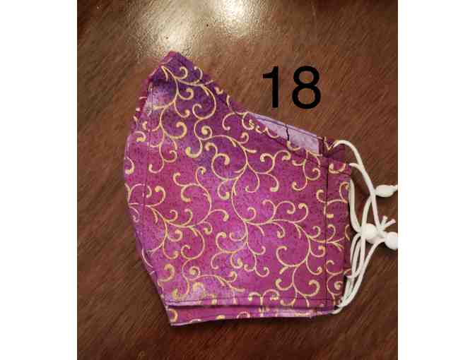 Beautiful purple swirl mask with gold swirl designs in the fabric! Two layers of 100% cotton with slit for filter. Can be reversed to beautiful light purple / dark purple blend of color. The elastic for the ears has little adjusters included. Not for medical use.
