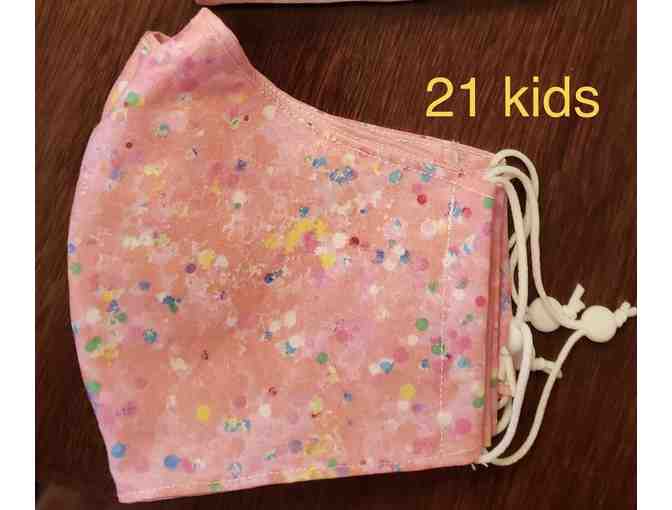 Beautiful pink child size mask!  Two layers of 100% cotton with slit for filter.  Can be reversed to solid pink.  The elastic for the ears has little adjusters included.  The ages are approximate for the mask.   Not for medical use.