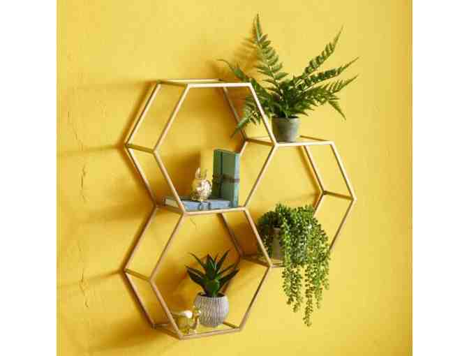 Luminous matte gold finish sets off the chic contemporary honeycomb design of this wall shelf. Position your favorite knickknacks, succulent plants or books on the five glass surfaces for a look that's all your own.