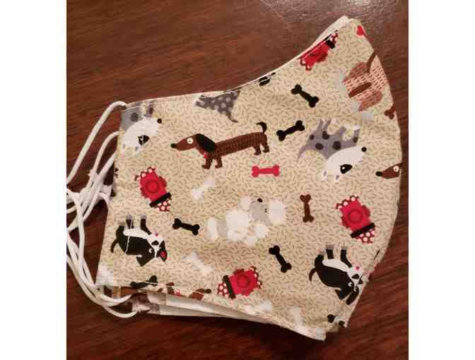Beige background with bones, paws & dogs.... including dachshunds!! Two layers of 100% cotton with slit for filter. The elastic for the ears has little adjusters included. Not for medical use.