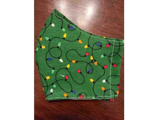 Green with holiday lights! Two layers of 100% cotton with slit for filter. The elastic for the ears has little adjusters included. Not for medical use.