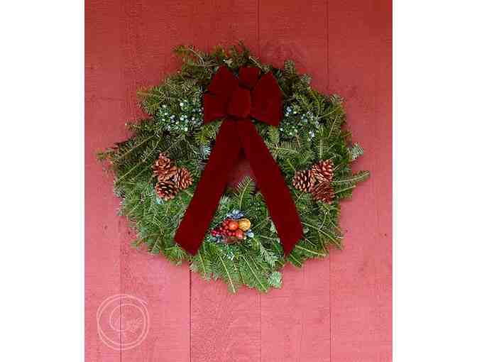 The Pemigewasset is a 22′ double sided balsam fir wreath. This elegant wreath is adorned with a six-loop burgundy velvet bow, features faux juniper sprays, and is finished with clusters of natural pine cones and a faux nut pick. The Pemigewasset is named after a river in central New Hampshire, one of the Three Rivers to give its company its name!