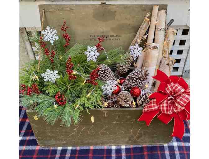 This trunk was salvaged from the Boxborough transfer station, and we think it could be a WWII footlocker. It is dark green and was made by The Warren Co., Inc., dated 1943. It would be ideal outside on your covered porch but could also be used inside next to your fireplace! It is filled with fresh white and scotch pine, pinecones, white birch logs, white snowflake tinkle lights (battery), snowflakes with a red and plaid bow. The greens are in a bucket with oasis and water to keep them fresh all season long. The trunk is approximately 34" x 16.5" x 26"H, and with the lid opened the height is about 30''.