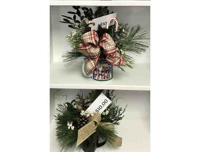 This is the perfect little arrangement to add a bit of winter cheer! Each mug is filled with fresh white pine, cedar and juniper and is decorated with a seasonal bow, red or white berries, pinecones, shiny balls or bells. Each one is unique. Keep the oasis watered and this arrangement will last 6 weeks plus.
