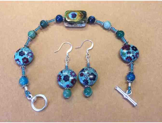 Blue flowers set: 7-3/4" bracelet, glass beads
