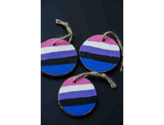 Block color ornaments (genderfluid flag) painted on wooden circles. ~2" in diameter