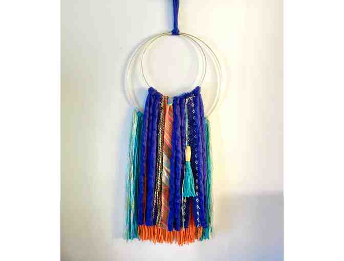 Handmade wall hanging with brass rings and a variety of yarns and fabric strips in blues, greens, and oranges. About 15" by 24".