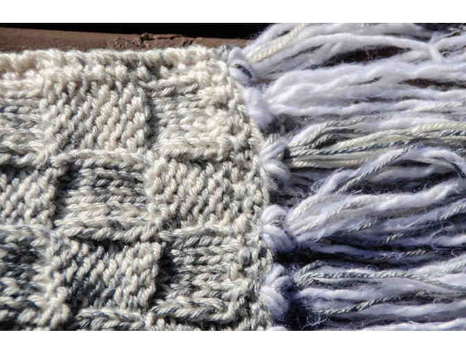 Hand knit patterned grey scarf with fringe. 6 inches wide, 32 inches long plus fringe.