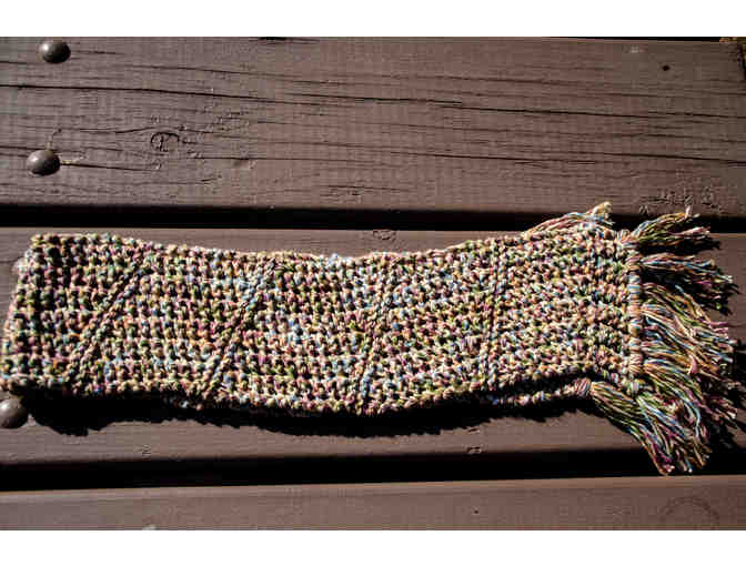 Hand knit long, textured scarf with fringe. 6 inches by 46 inches plus fringe