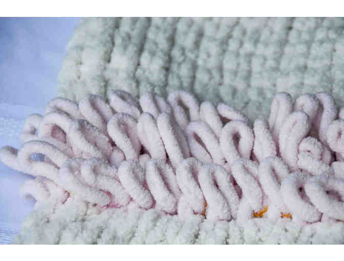 Super soft knitted small blanket (27" by 27") with interesting loops to help keep one centered (and warm) during distance learning