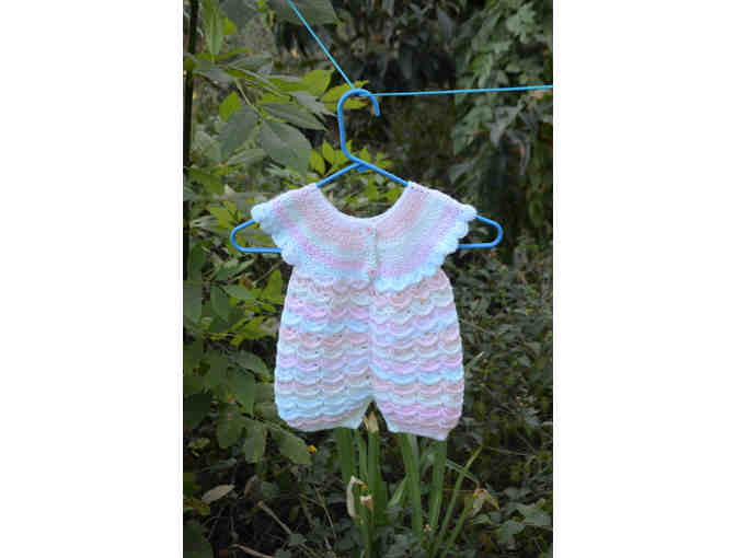 Croched Romper, shown on an adult hanger.  SIze 12 month.