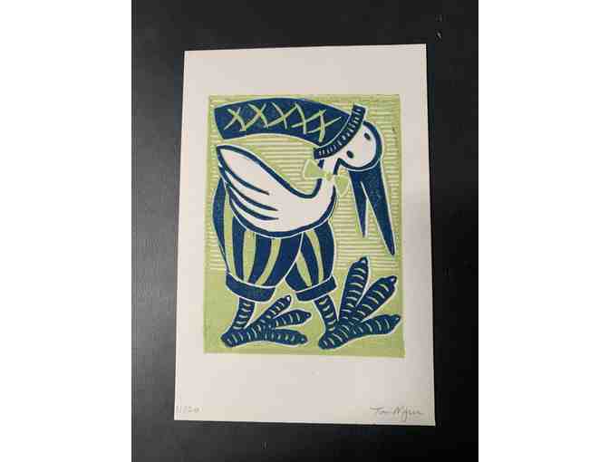 Children's author & Wavely parent Tao Nyeu's whimsical top hat wearing stork in striped pantalones small 4" x 6" numbered 11/20 silkscreen