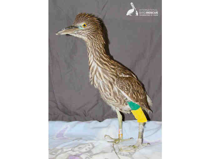 Baby Black-crowned Night Heron, one of the victims of the Oakland tree fall, sports Oakland A's colors on its injured leg. Photo by Isabel Luevano.