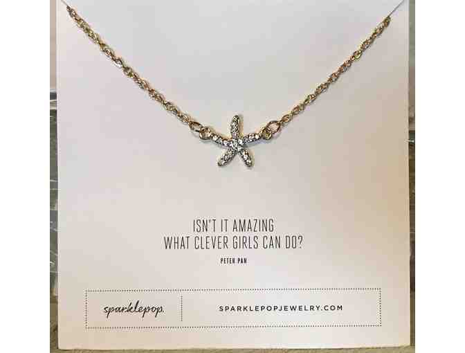 Gold toned key with rhinestones and gold toned chain. Great gift for a young girl