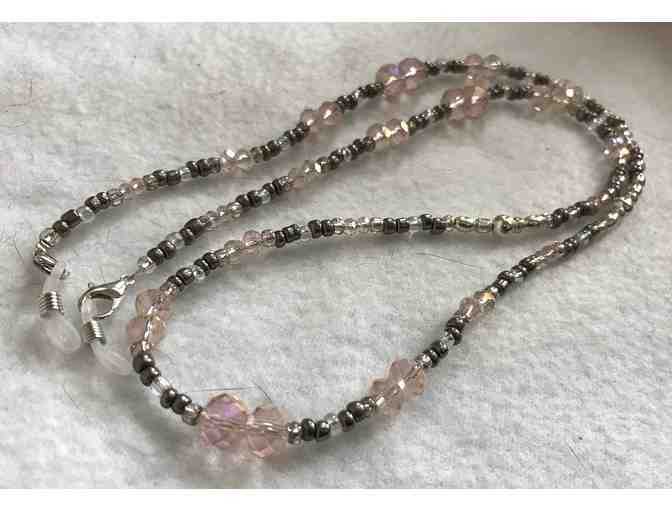 These lovely handcrafted beaded chains can be used to hold your eyeglasses or mask around your neck so you don't set it down somewhere and forget where you put it! Lobster claps are on each end and eyeglass holders (included) can be attached to the clasps and easily used with your eyewear. Approx 29” clasp to clasp