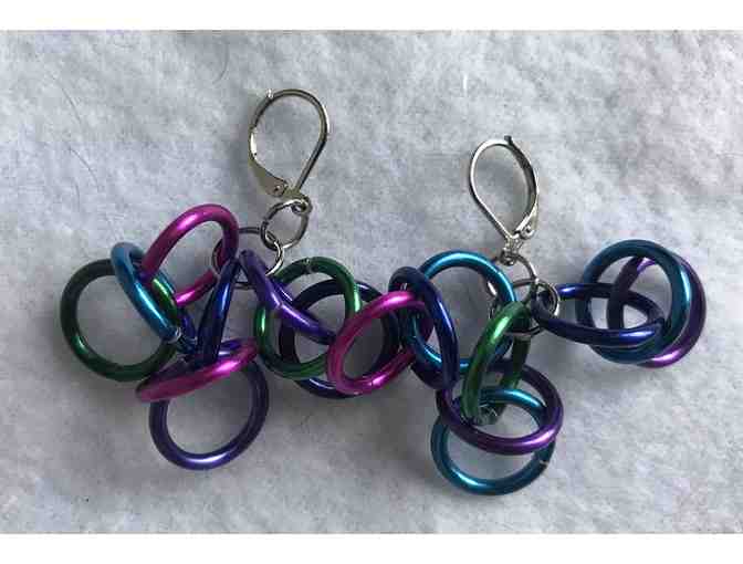 These cuteearrings are links of multicolor chainmail attached to a silver leverback. Approx 2 in long