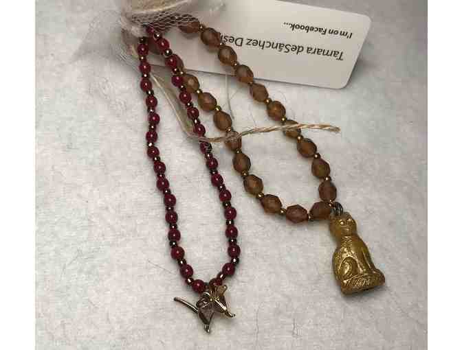 Double, pre-stretched, USA made elastic, stretch bracelets. All are made with glass from the Czech Republic. The charms vary, most are metal with shapes of kitties or eyes or hands. One size fits most.