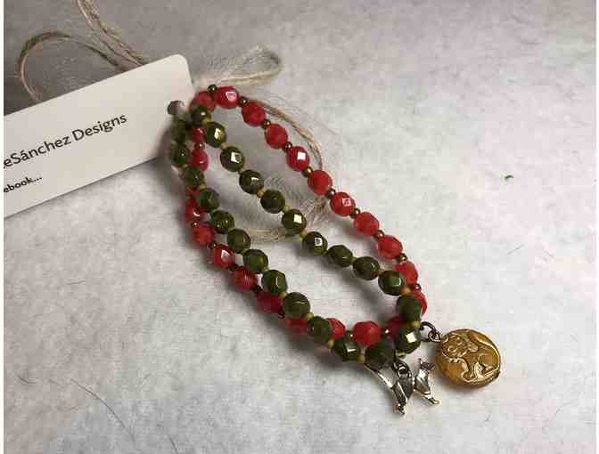Double, pre-stretched, USA made elastic, stretch bracelets. All are made with glass from the Czech Republic. The charms vary, most are metal with shapes of kitties or eyes or hands. One size fits most.
