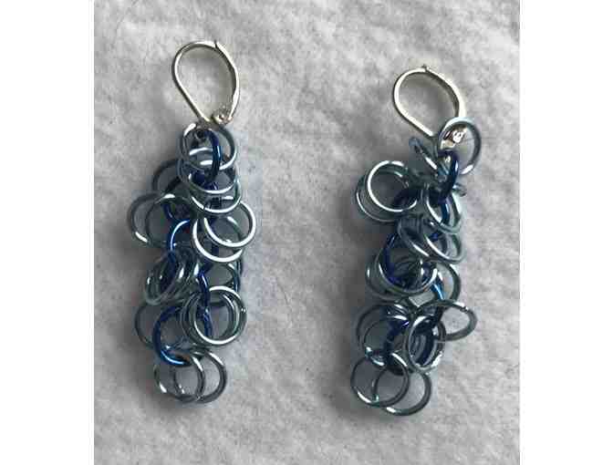 These cute earrings feature blue chainmail dangling from a sivler toned leaverback. Approx 3 in long