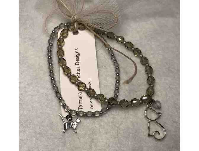 Double, pre-stretched, USA made elastic, stretch bracelets. All are made with glass from the Czech Republic. The charms vary, most are metal with shapes of kitties or eyes or hands. One size fits most.