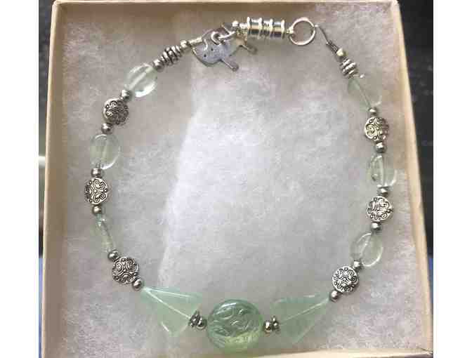 8" bracelet with light green glass beads with silver cat and strong magnetic clasp.