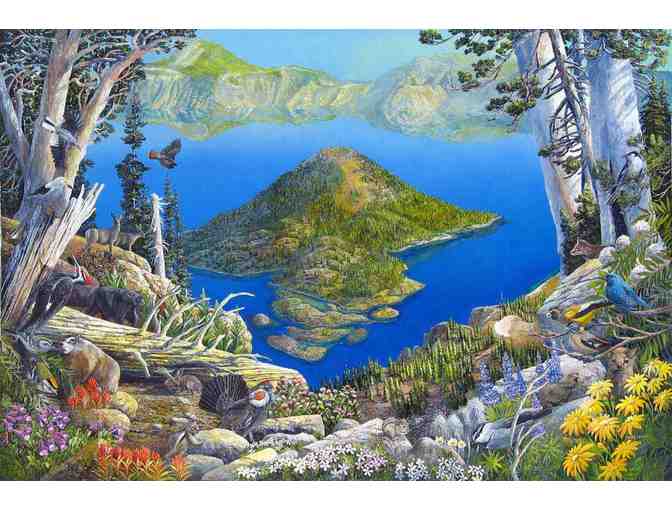 Take home this beautiful poster of Oregon's very own Crater Lake National Park featuring the wildlife and trees surrounding the lake.