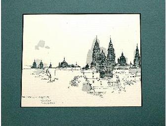 Own a piece of history with this lovely print of Santiago de Compostela, Spain. Earl Drais Layman, architectural historian, professor and talented artist, documented Seattle and his world travels in pen and ink and watercolor. In addition to a degree in architecture, Earl earned a certificate in painting and history from the Ecole des Beaux Arts at Fontainebleau, France in 1951. Matted, in oak frame (not shown), measures 14" x 16".