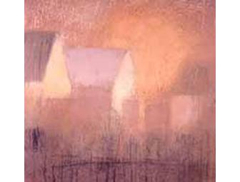 Against the iridescent peach patina of evening light, Irma Cerese's buildings glow and call us within. Subtle and explosive interplays of paint and light create a luminous, ethereal atmosphere, as Southward/Evening at once