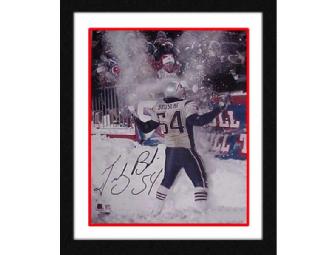 This is a hand signed photograph of the Tedy Bruschi, middle linebacker from the Super Bowl XXXVIII Champion New England Patriots during the "Snow Bowl" in 2003. This photograph is professionally framed and matted in Patriots colors and a black wood frame. Bruschi is viewed as the heart and soul of the Super Bowl Champion defense which features no superstars, just a bunch of rugged performers like Bruschi who give it 110% every game.'