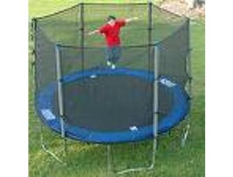 Airzone Spring Trampoline is eight feet in diameter and fits easily in most backyards. Four leg construction provides added stability. Safety enclosure and thick rail padding allow for a safe bouncing environment for the whole family.