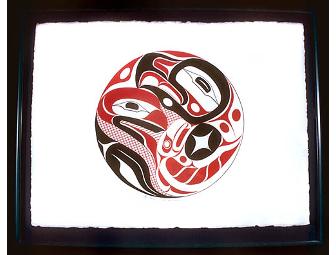 In 1997, Captains City Brewery commissioned noted Northwest carver Jay Haavik to create a label for their stout beer. He presented two designs with Eagle, Bear, and Salmon circle motifs. One image was chosen to decorate their bottles and the other appears as this print. Stonehenge paper, 22” x 22”, 1997, edition of 150. Unframed.