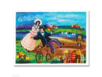 TAKE A STEP INTO EXQUISITE COLOR AND FESTIVITIES OF THE REMARKABLE ARTWORK OF SHLOMO ALTER! Bright colors and quaint countryside make this piece unique! "Just Married" is a limited edition serigraph on wove paper by Shlomo Altered, numbered and hand-signed by the artist! Includes Certificate of Authenticity! Measures approx. 13" x 10" (with border), 12.5" x 9.5" (image). Listprice: $390.00