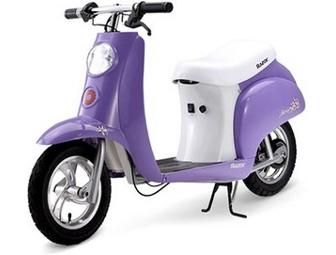 The Razor(r) Pocket Mod(tm) scooter allows children to cruise down the path at speeds up to 15 miles per hour. The miniature electric scooter can travel up to 10 miles on a single charge, and carries riders up to 150lbs. The scooter features 12-in pneumatic tires and rear suspension for a smooth ride, as well as twist-grip throttle acceleration control and a hand operated rear brake. There is a convenient storage compartment under the seat.