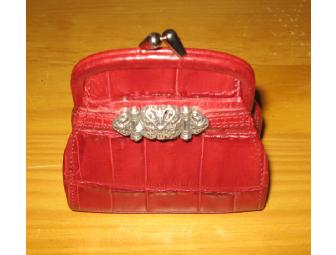 This is a darling little coin purse. It's made from red crocodile stamped leather. Silvertone fixtures and filigree adornment.