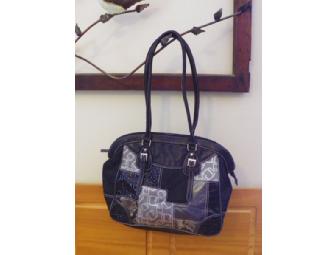 This trendy, chic shoulderbag is predominately black with a patchwork quilt of various coordinating materials - fabric and faux leathers. Made from manmade materials, this bag has been lightly used. The piping on the bottom of the bag is slightly worn. A zippered top opens to a very room compartment with two accessory pockets. The inside of the bag is impecably clean. A great bag for this fall.