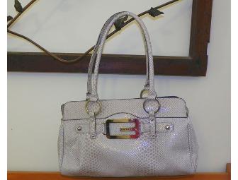 This eye catching GUESS satchel is made from a pale faux leather with chunky chrome hardware. Three compartments provide lots of room. zippered pockets and slip pockets help keep all of your belongings organized. Used - outside shows no wear. There are some slight smudges on the inside lining.