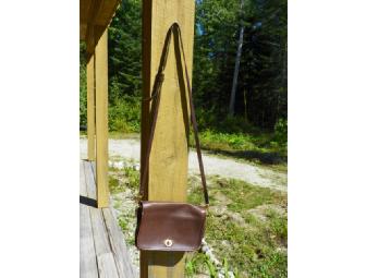 This is a classic browl leather coach shoulder bag. It has an outside flap close with a brass twist clasp. Inside is are two slip pockets. It has the Coach id stamped on the pocket. ID no. JSN-9755. In good condition. The bag shows its previous use by the gentle scuffs and creases that are typical with well loved Coach bags.The bottom edges show a bit of rub wear.