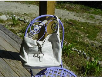 This Dooney & Bourke bag is made from a lovely soft simulated leather (I'm guessing - can't find a materials tag in the bag). It has an open top with a chunky chrome-tone snap and loop fastener. The inside is lined with a red and white fabric. It as a zippered pocket and a cell pocket inside. This bag has a few smudges on the back side and bottom that from previous use as well as a pen mark inside. Even so, if white is your color, this bag shouldn't be passed up!