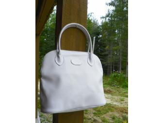 Lovely double handled bag. White faux leather trimmed in white patent leather. Simple elegance.