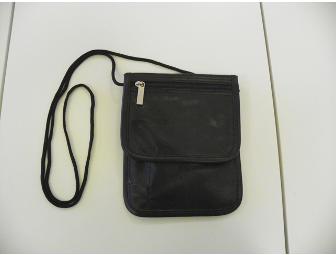This little passport/travel purse by Brookstone can be worn around your neck or on your belt. Black leather with cording strap that can be knotted to shorten length. Flap closure opens to reveal a mesh zippered pocket, a compartment large enough for a passport and slip pockets for a notebook and pen. The outside there are two additional zip pockets. A very handy item for the traveller. Looks like new.