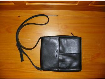 This is bag by Nine West is quite functional. A flap with magnetic snap opens to a main compartment with zip pocket and slip pocket. A zippered compartment opens to reveal slots for currency, credit cards, and a checkbook. It also has a pocket for eye glasses. This bag looks like new with a few almost unnoticeable scuffs. Very sharp looking!