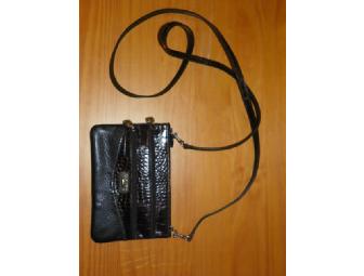 This little purse is perfect for a night out. Three zippered pockets, silver and gold-tone embellishments. Pebble texture black faux leather with brown faux leather crock print accents.