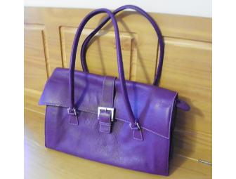 An eye catching tote that may be the pick of the auction! This fabulous pebble leather tote in purple has a flap with magnetic snap hiding behind the silver buckle. It opens to reveal three compartments. The center compartment has a zippered closure and has an eye glass case inside. Two compartments are open – one has card and pen slots. Silver tone feet help to protect the bottom. All compartments have purple fabric lining. A must have from Great American Leatherworks.