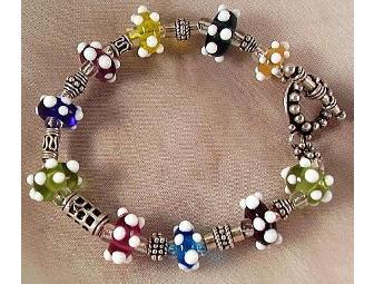 Designed in traditional lampwork style, these multi-colored bumpy beads are simply fun to wear, more fun to touch! Unusual Bali silver adds to the charm and glass rondelles add to the sparkle of this lampwork bracelet. Certain to compliment almost any outfit in your closet, you will reach for this cute lampwork bracelet and matching earrings often! The bracelet is 7.5 inches in length. Matching earrings included. An incredible jewlery duo that is sure to capture your heart. The essence of Deb Rich's artistic expression is revealed in each lampwork bead that she creates in her studio. Deb's beads exhibit her desire to create and inspire change through community outreach. These jewelry pieces are offered exclusively through cMarket to support the fundraising efforts of non-profit organizations. Lampwork glass reflects both the heartfelt passion and interpretative expression of Deb Rich. Her artistic resume includes fantasy sculptures, creatively fashioned from found-objects and recycled materials. Deb's Glass Designs are truly hypnotic, one-of-a-kind pieces that cannot be replicated or manufactured by a machine. Deb only sells jewelry pieces that capture the grace and flow of glass artistry. All jewelry is made with sterling silver or copper findings, Czech or Swarovski Crystals, and various complementary beads, making Deb's Glass Designs positively the best choice.