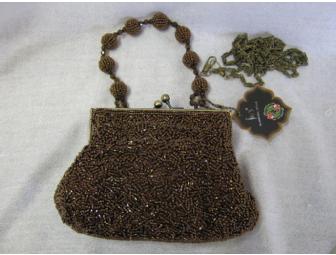 Brown beaded handbag measures 6 inches at widest point. Bronze tone trim with attrative beaded purse handle. Also included is bronze tone shoulder strap chain. Can be worn as clutch, with short strap or shoulder strap.