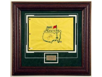 This authentic Masters flag is hand signed by Jack Nicklaus and is beautifully hand framed with a detailed nameplate. Considered one of the more most valued items of golf memorabilia. A certificate of authenticity by Executive Sports Memorabilia is included.